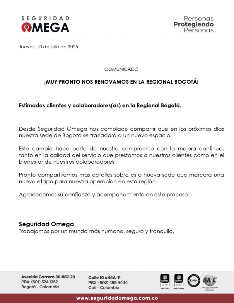 From: "Colaboradores Seguridad Omega - Bogotá" <boletin@PROTECTED>