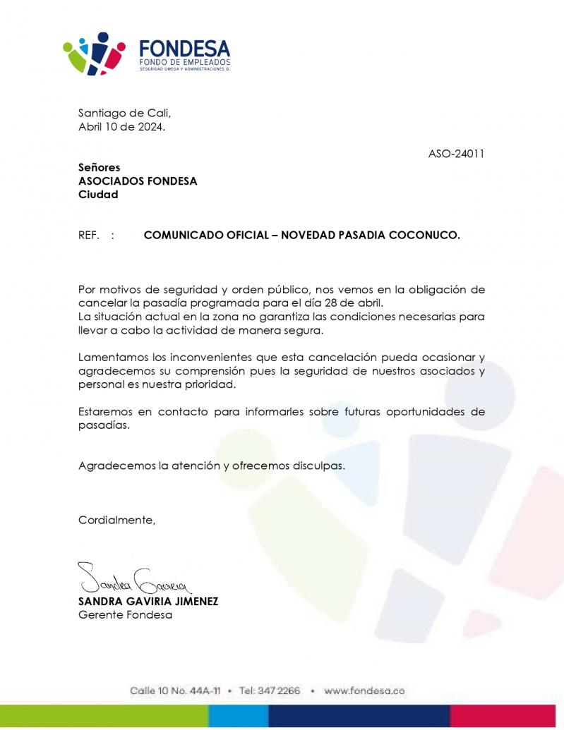 COMUNICADO OFICIAL CANCELACIÓN PASADÍA COCONUCO